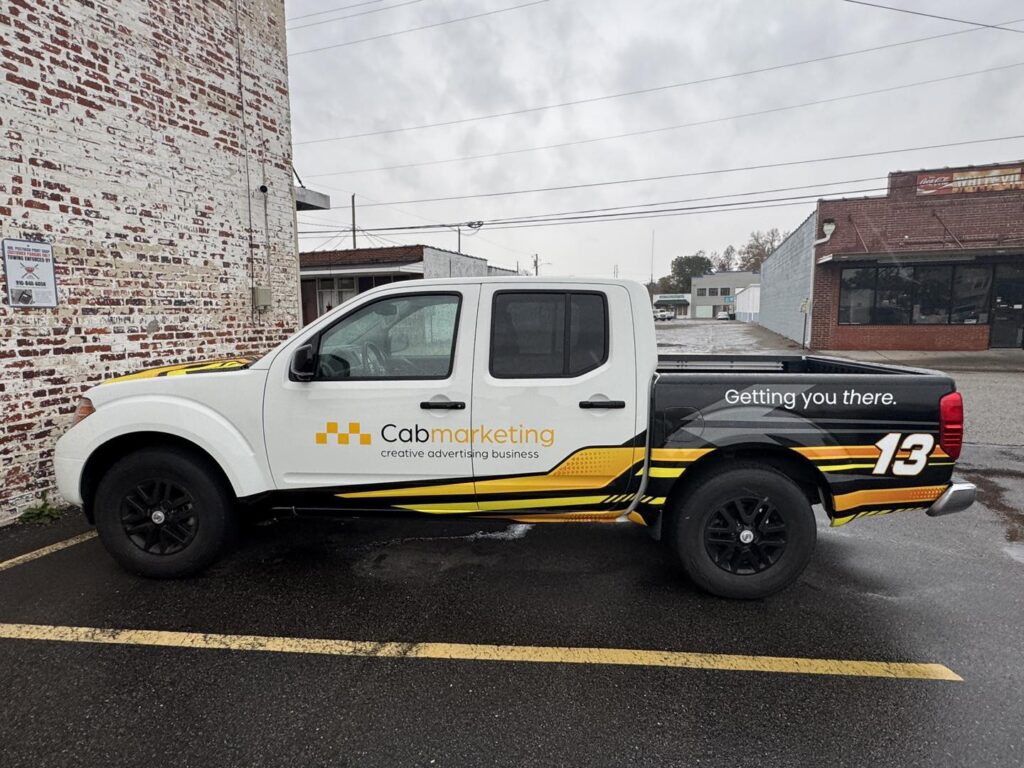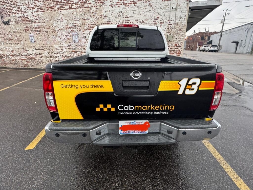 The finished Nissan Frontier is now a head-turner on the road, effectively promoting CAB Marketing’s brand wherever it goes. The combination of bold design and strategic placement ensures that their message stands out, whether parked or on the move.