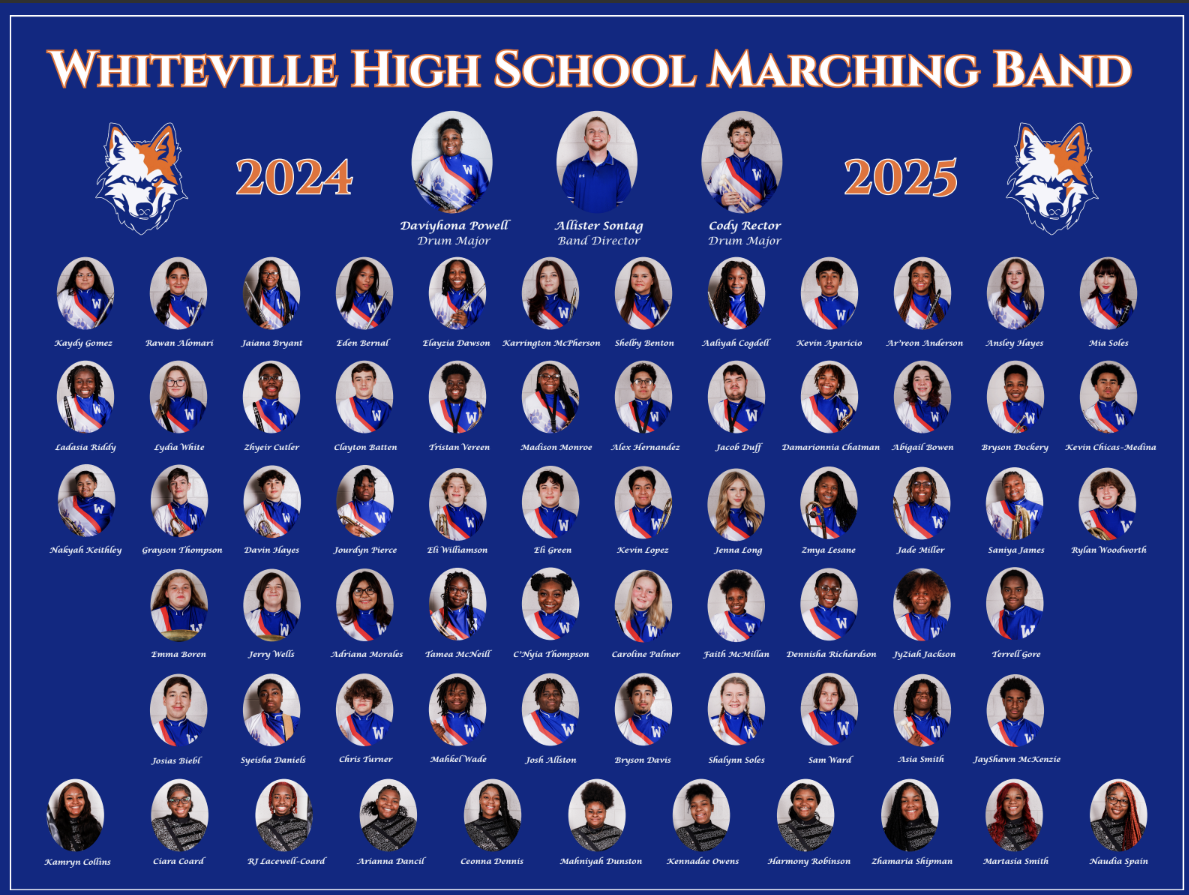 Celebrate the pride, unity, and spirit of the 2024–2025 Whiteville High School Wolfpack Marching Band with this official composite poster. Featuring professionally arranged individual photos of each band member, along with their names, this 24″ x 18″ keepsake captures the full lineup of the Pack for the season.