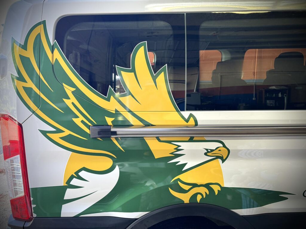 One of the standout features of this wrap is the dynamic eagle design on each side of the van, positioned toward the rear. These eagles, captured mid-flight, seem to soar across the vehicle, embodying the school’s motto of rising to excellence. The bold imagery adds a sense of motion and energy, making the van an eye-catching presence whether it’s parked or on the move.