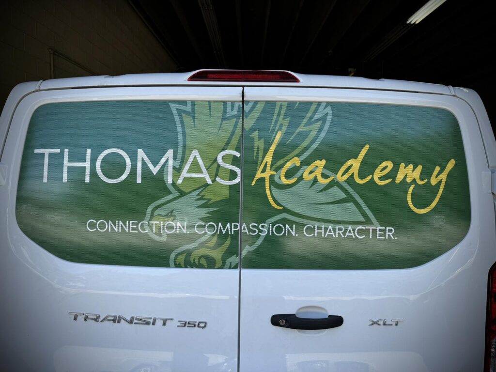 We worked closely with Thomas Academy to ensure the wrap captured their values and vision. The eagle design and color scheme were carefully chosen to represent the school’s spirit. - Precision Printing: