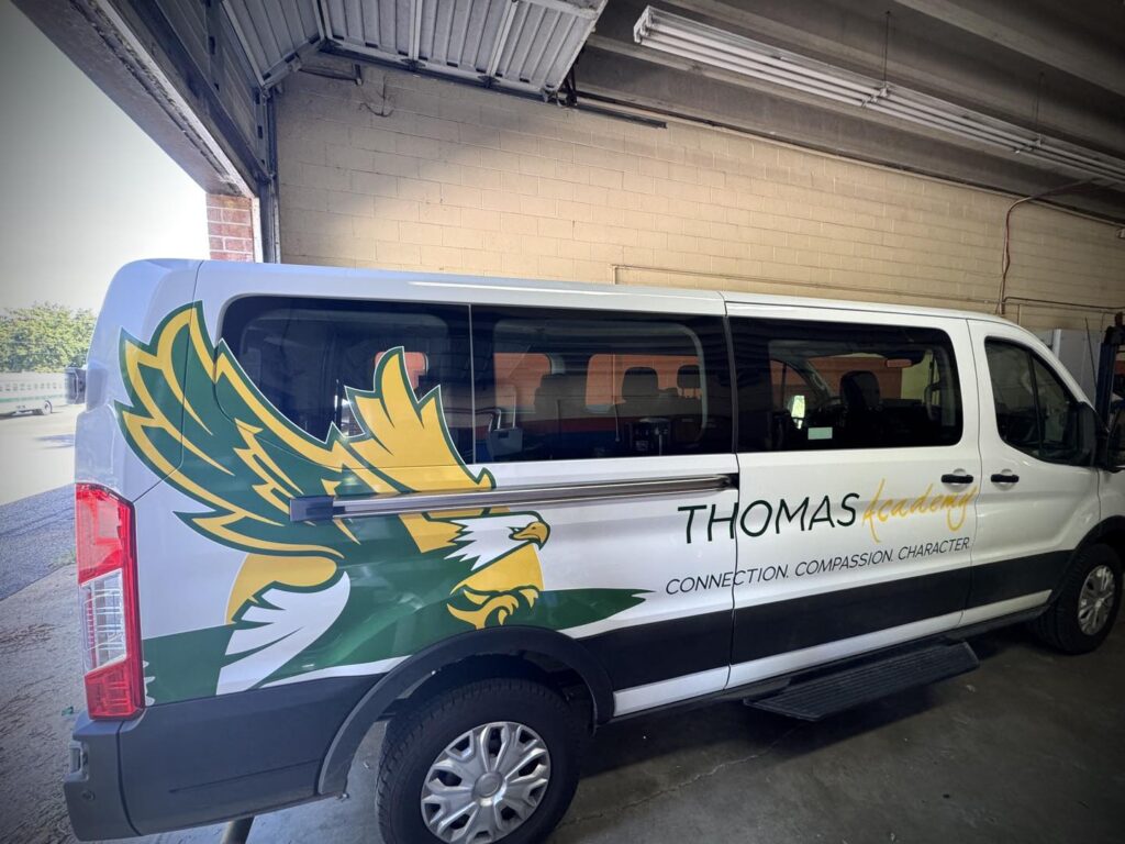 The finished van is more than just a mode of transportation—it’s a moving symbol of Thomas Academy’s dedication to excellence and their role in the community. The soaring eagles, bold colors, and professional design ensure the van stands out wherever it goes, inspiring pride among students, staff, and the community.